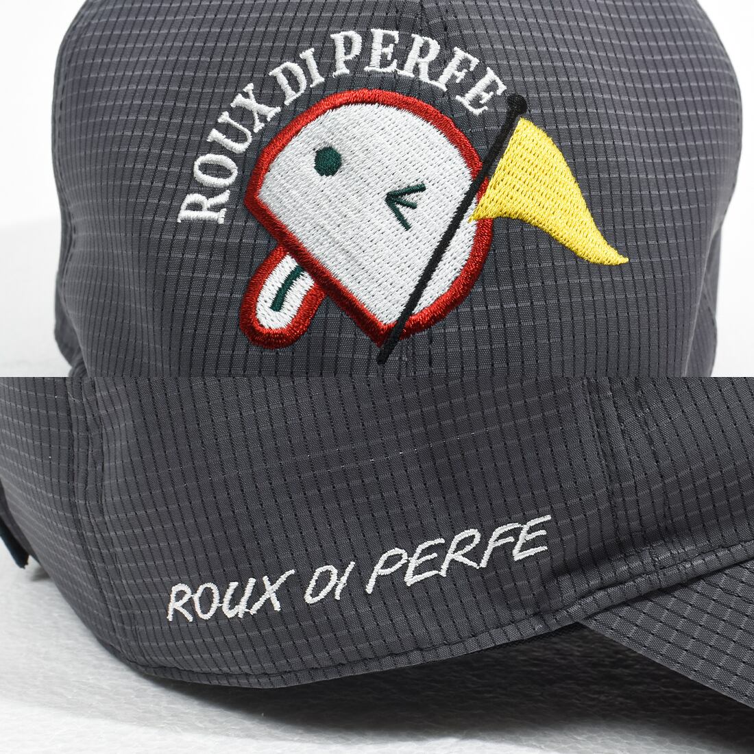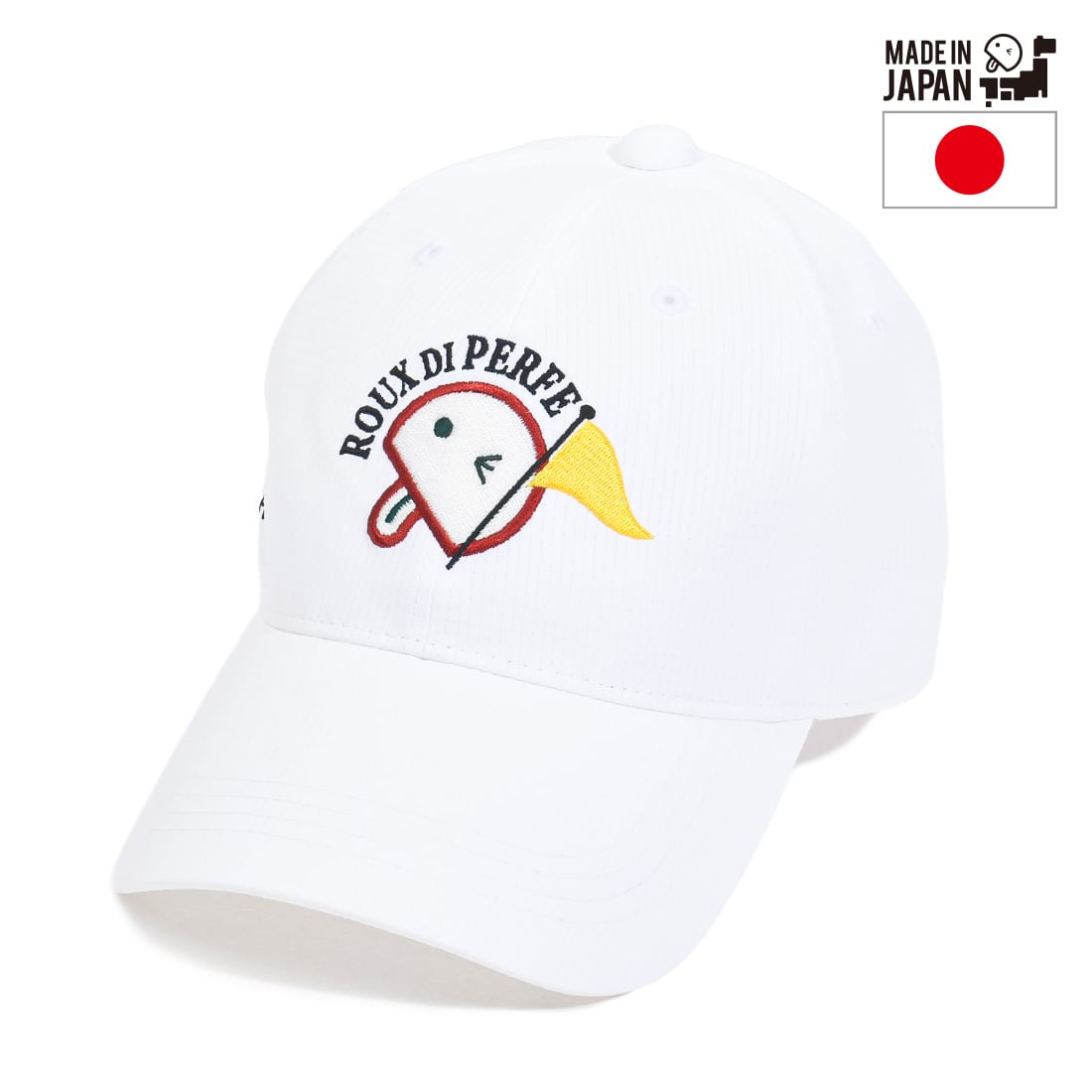 ベーマークの横に旗モチーフをあしらった、遊び心ある刺繍デザインのキャップ。