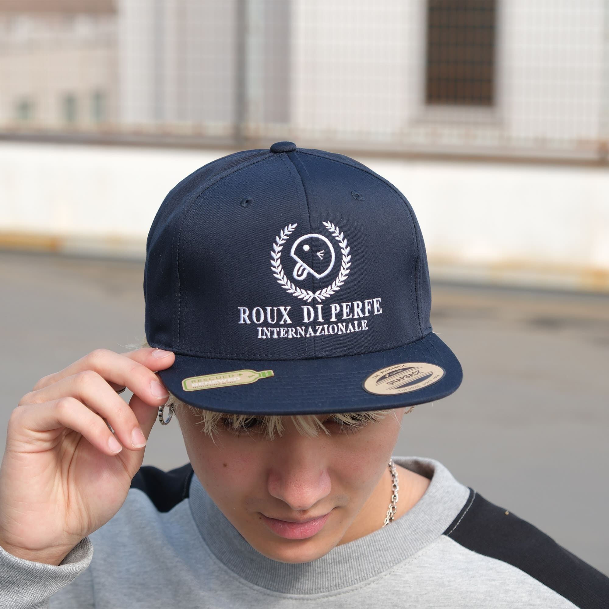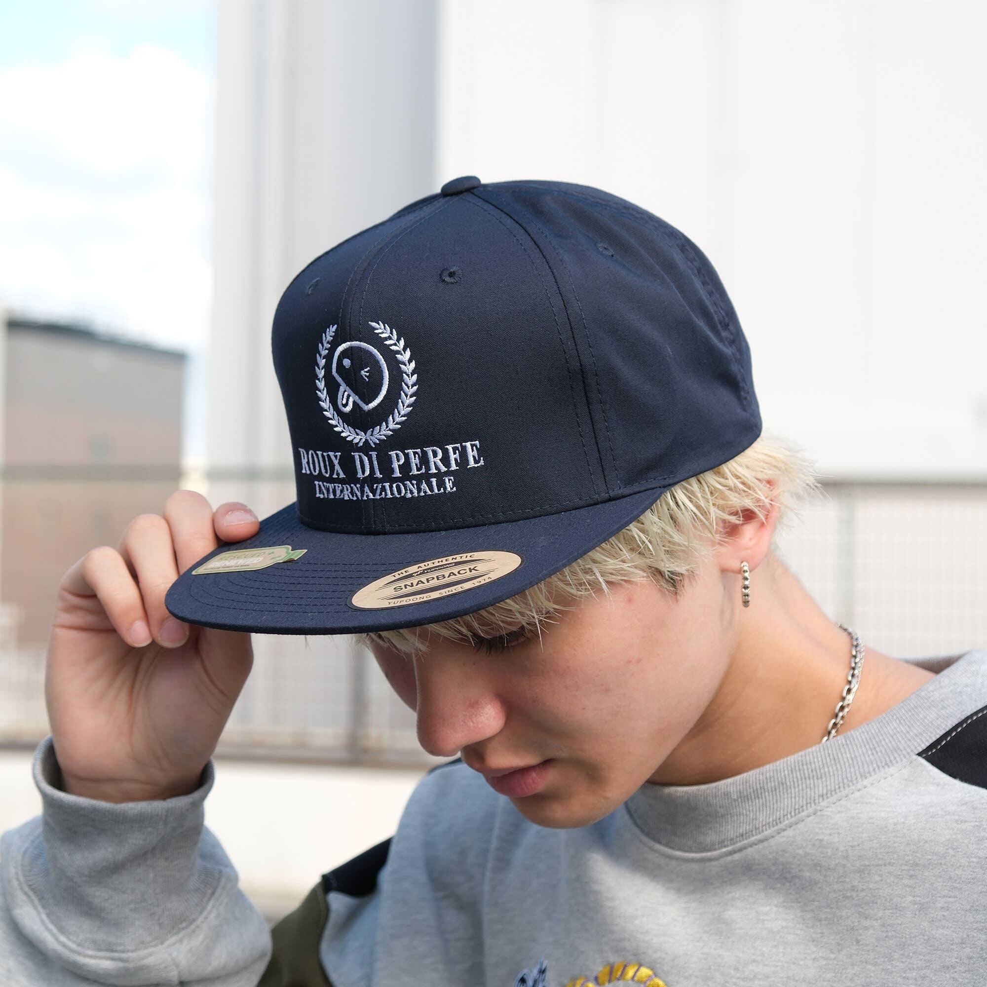 ツバはフラットに近く、ボリューム感とストリートらしいフォルムが特徴。