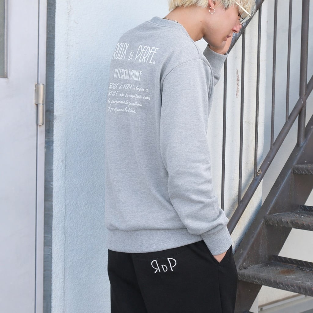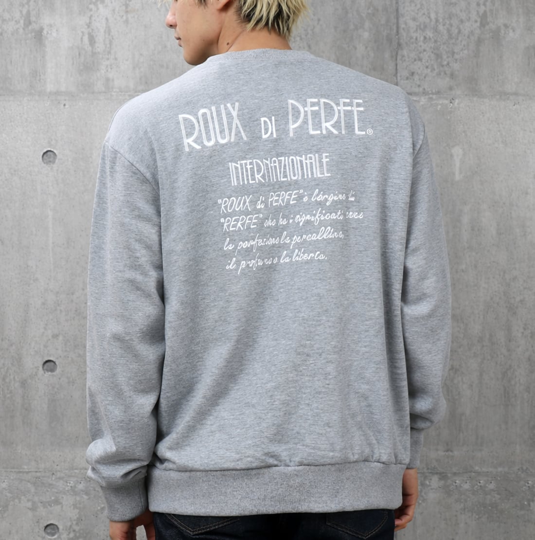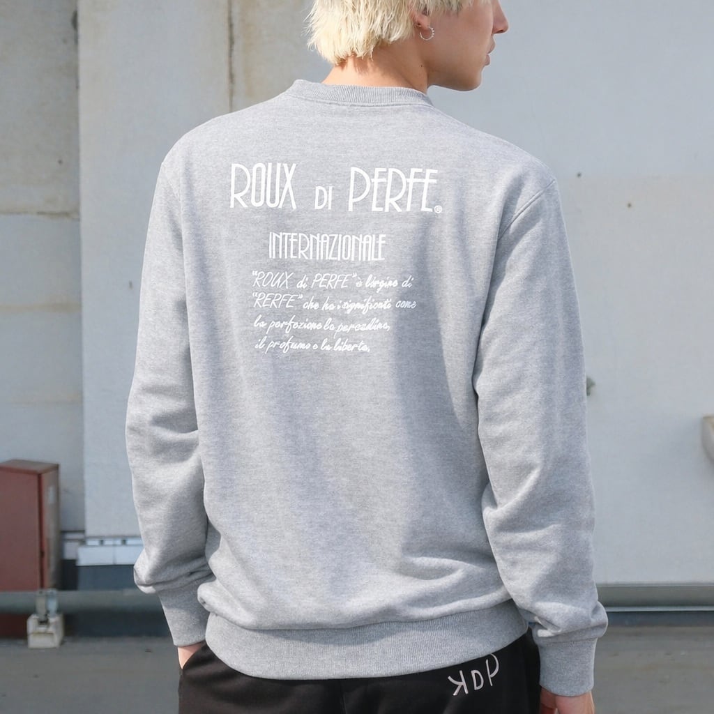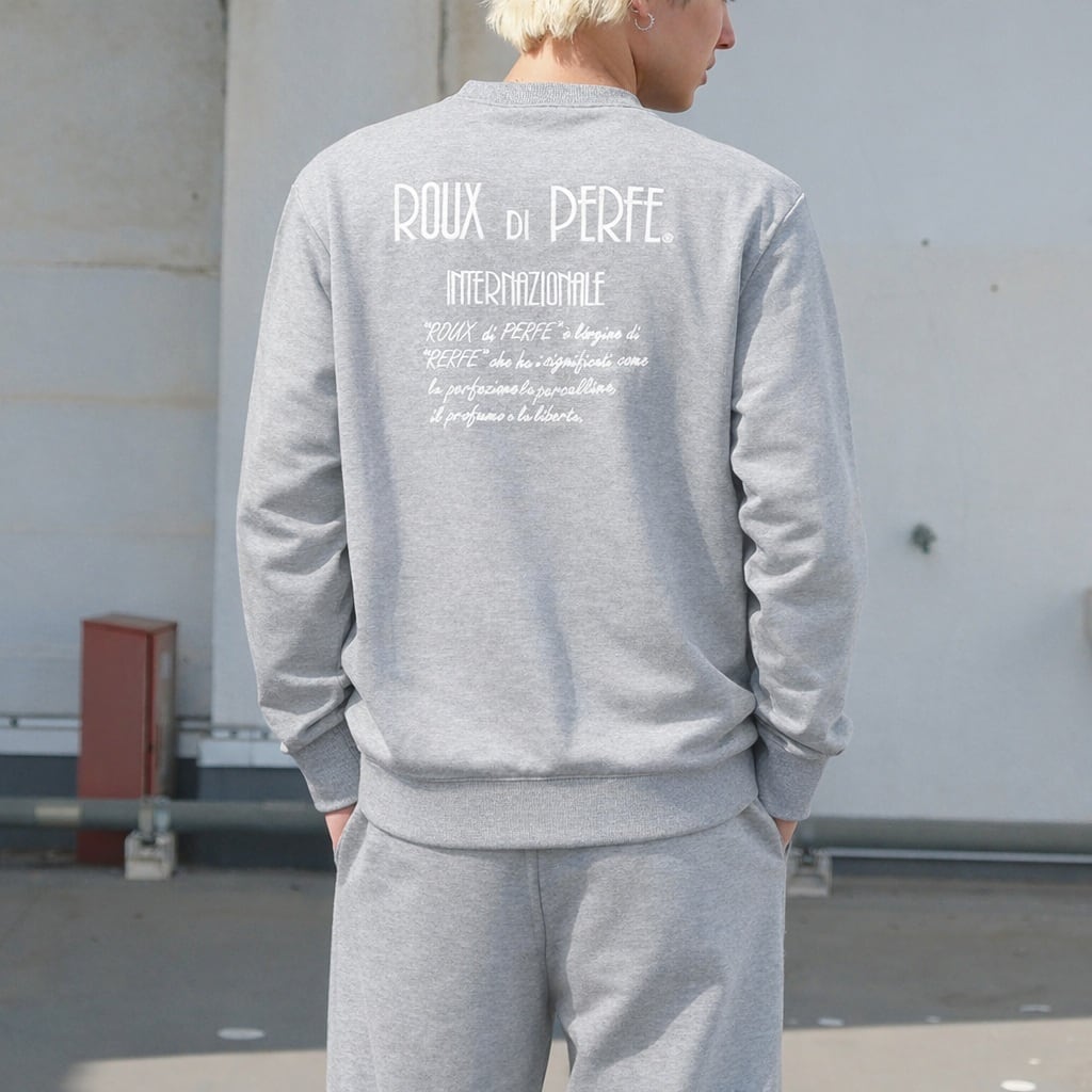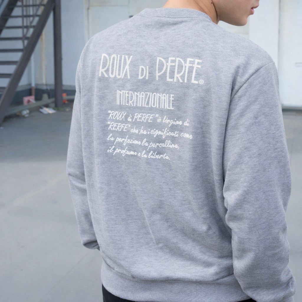 背面いっぱいに“ROUX DI PERFE INTERNAZIONALE”のロゴと由来テキストを刺繍した、ブランドの世界観を象徴する一枚。