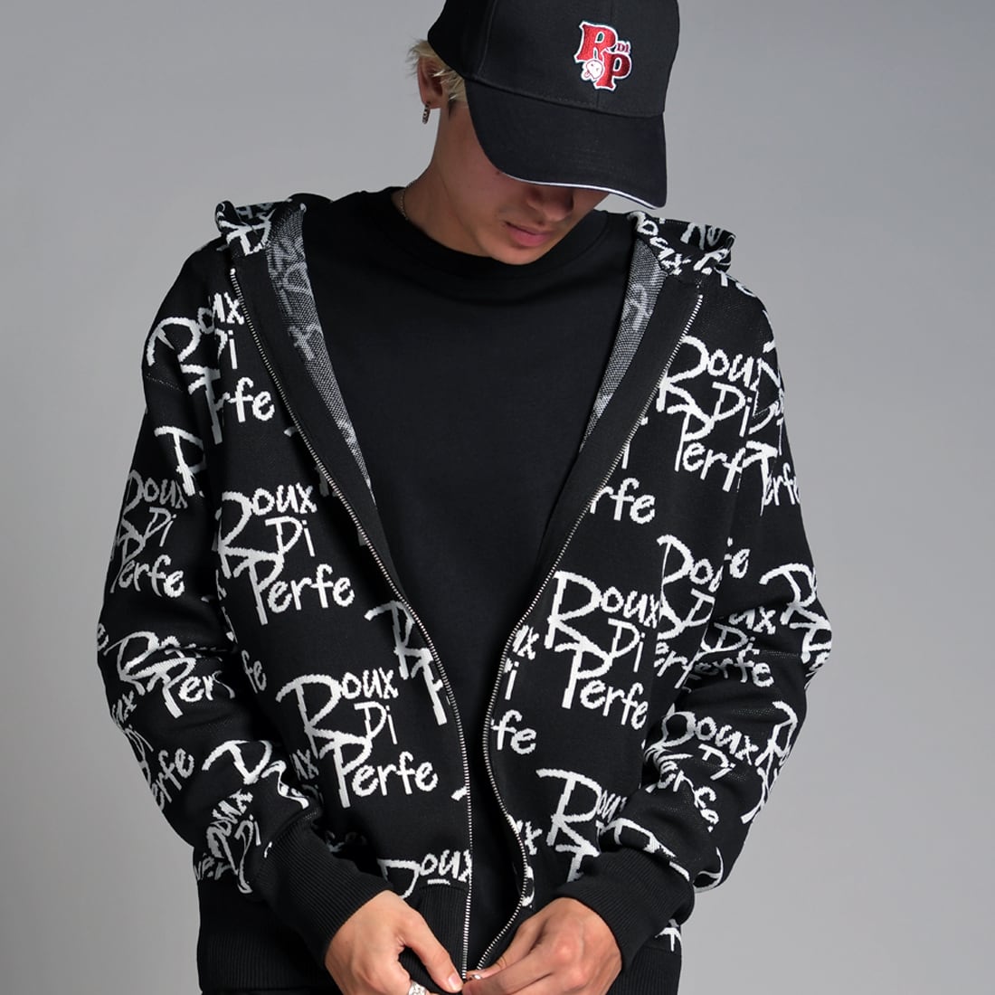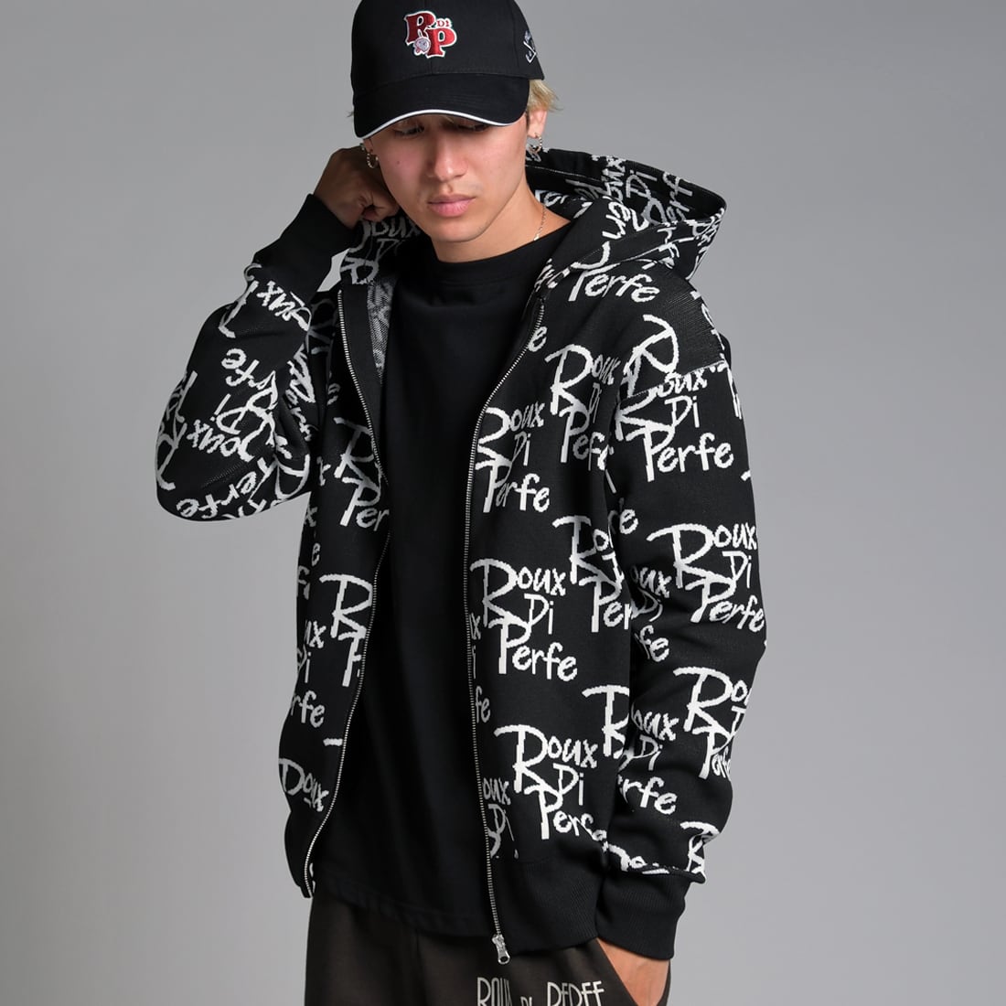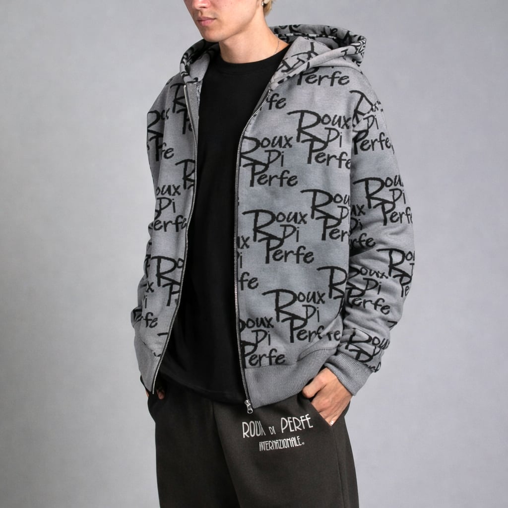 ROUX DI PERFEのアイデンティティを全面に表現した、オールオーバーロゴ仕様のジップアップパーカー。