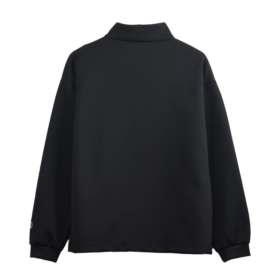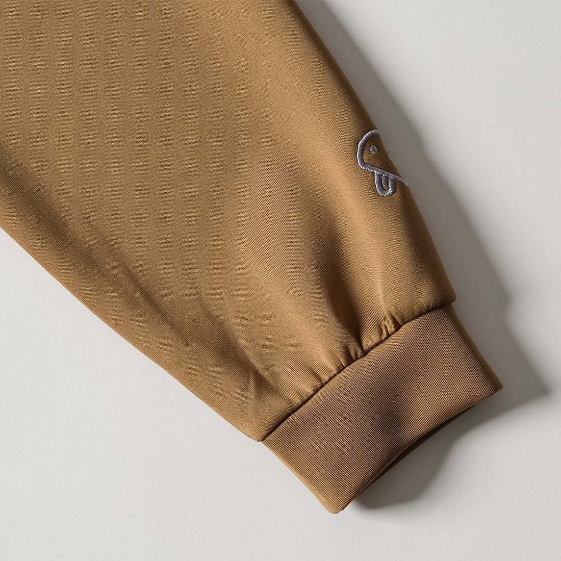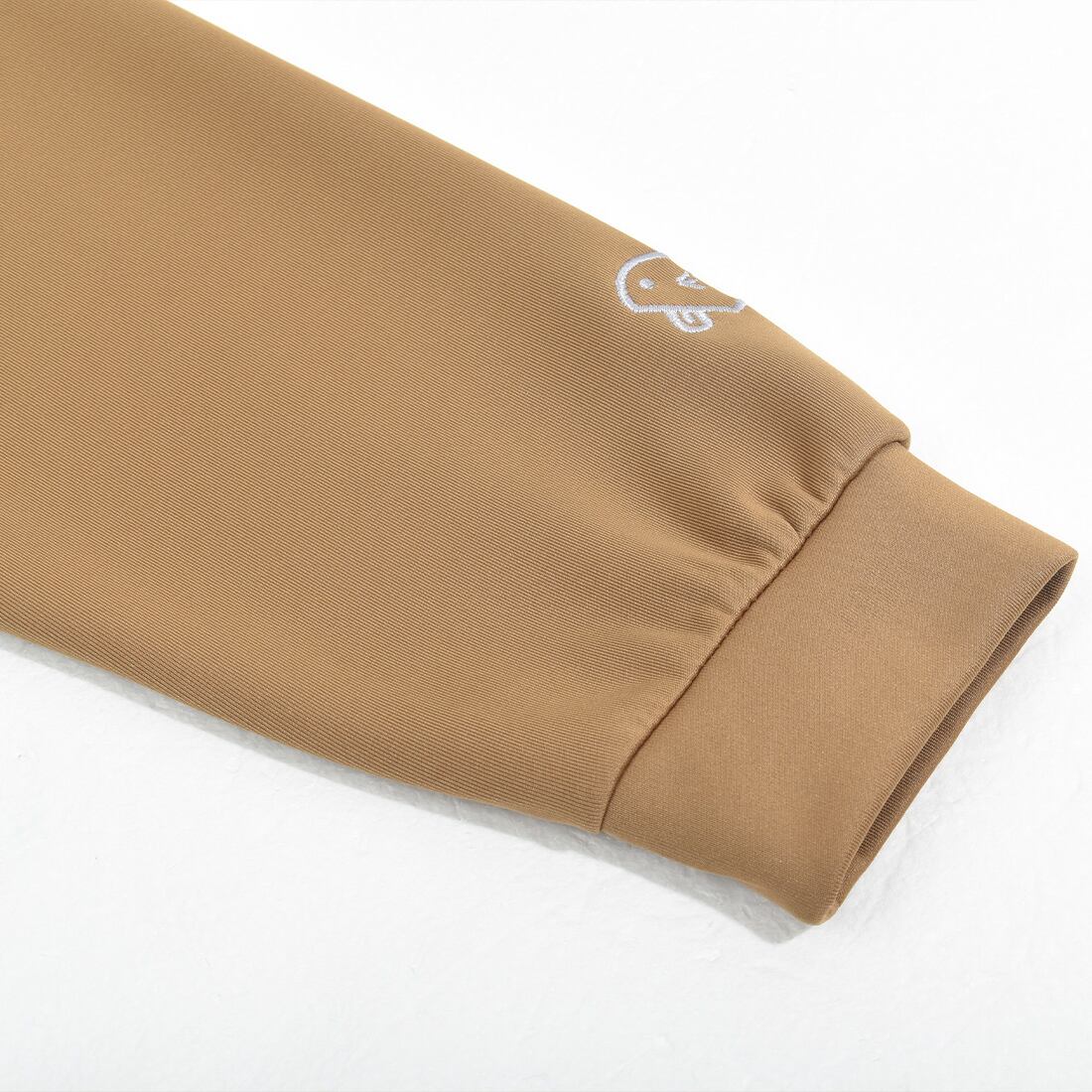 首元にはロゴ刺繍を配し、袖口付近にはさりげなくベーマーク刺繍を配置。