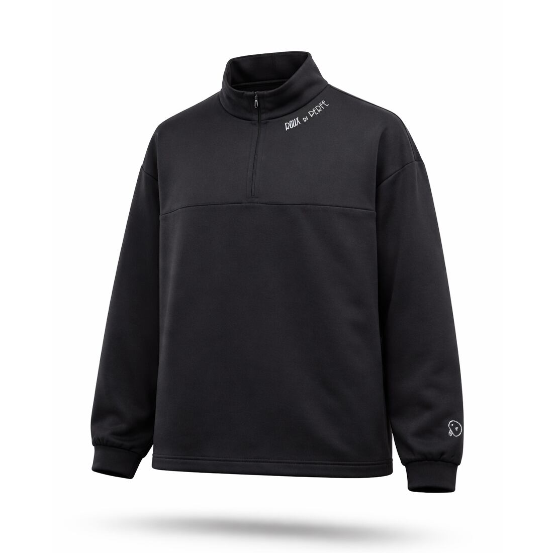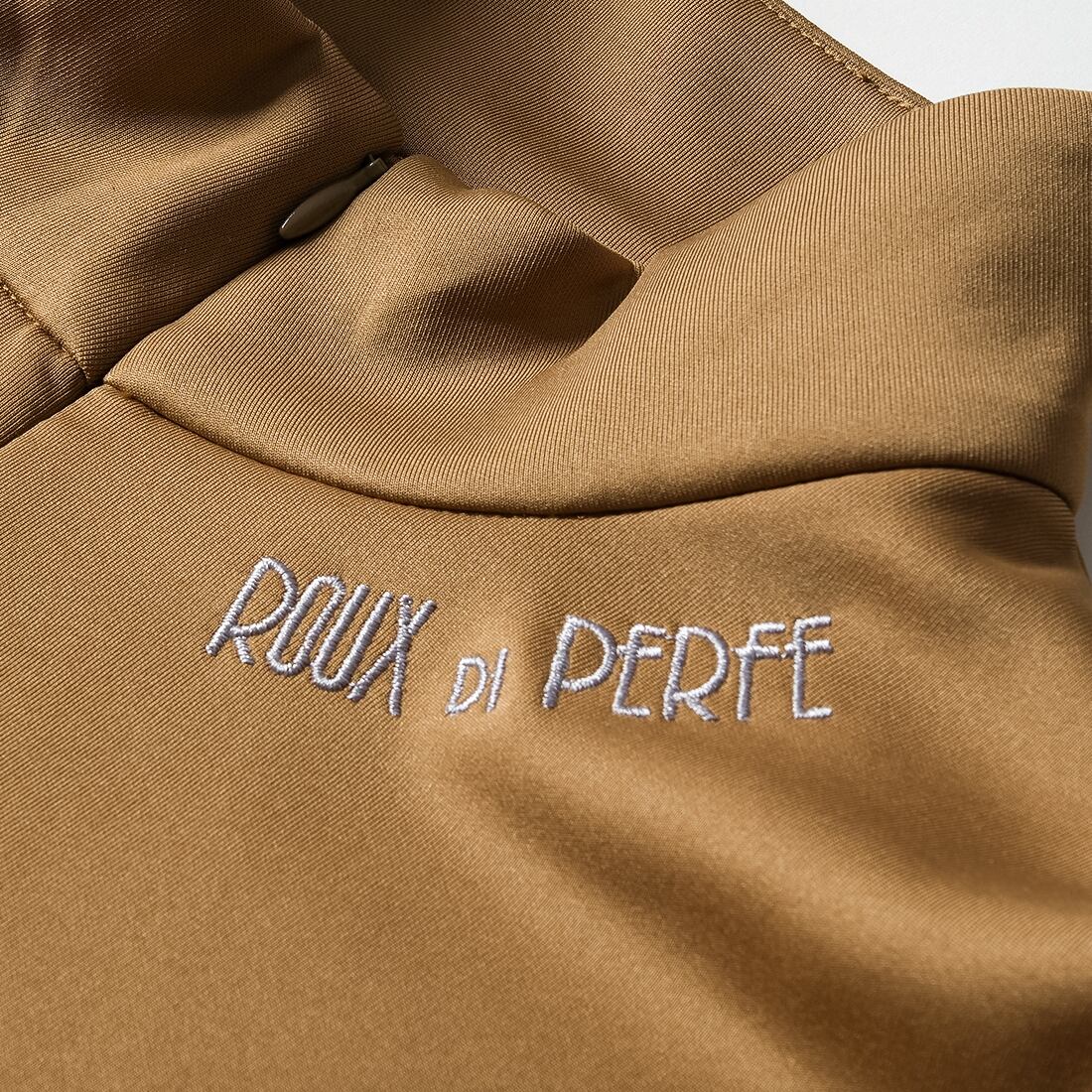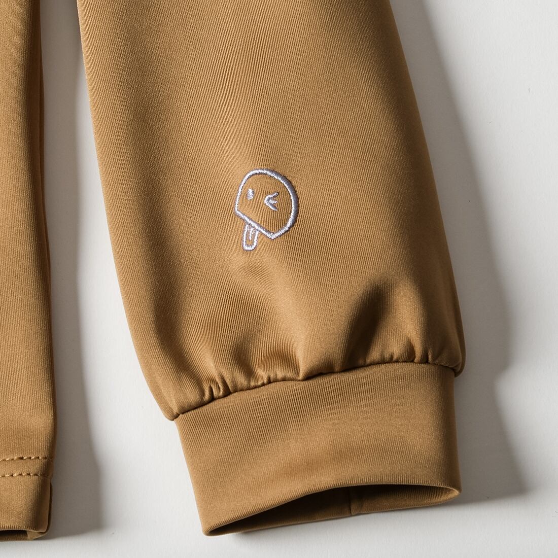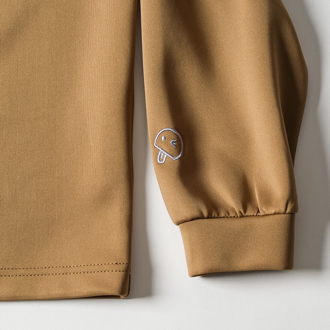 首元にはロゴ刺繍を配し、袖口付近にはさりげなくベーマーク刺繍を配置。