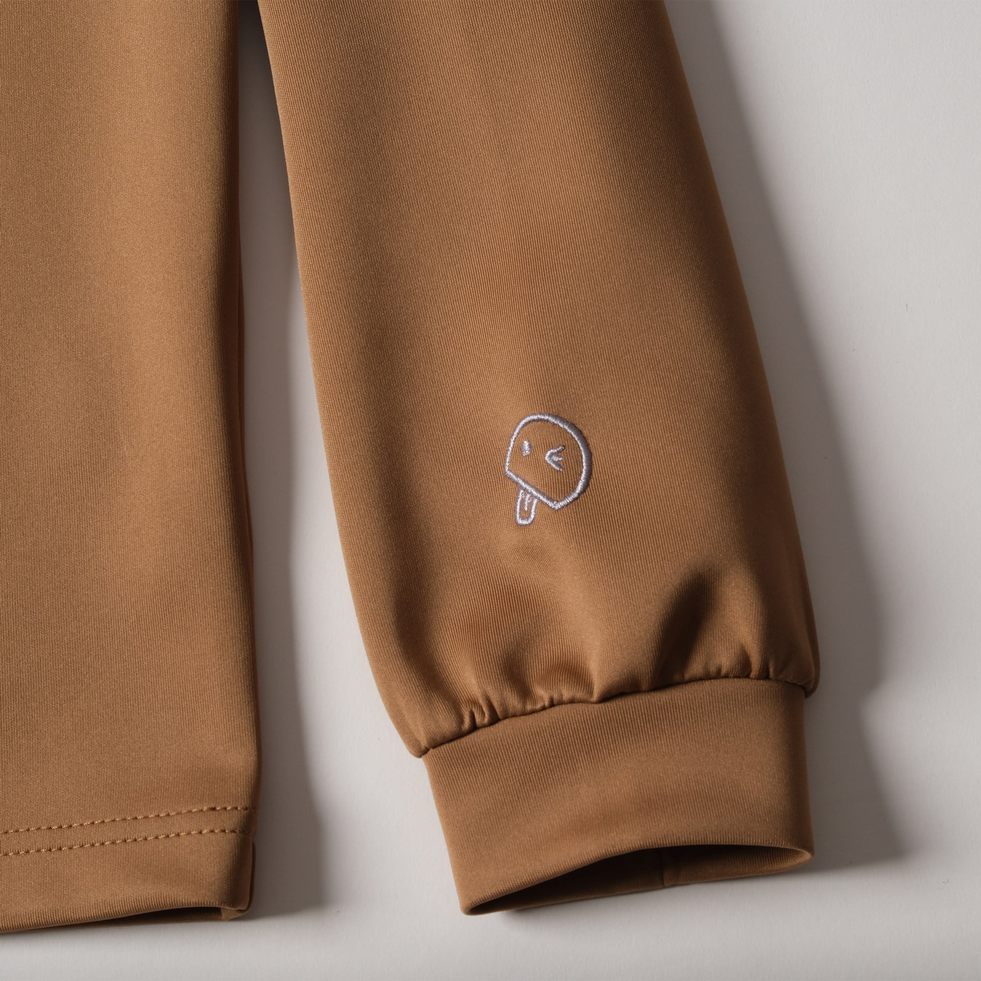 首回りにはロゴ刺繍、袖口付近にはさりげないベーちゃん刺繍がワンポイントになっています。