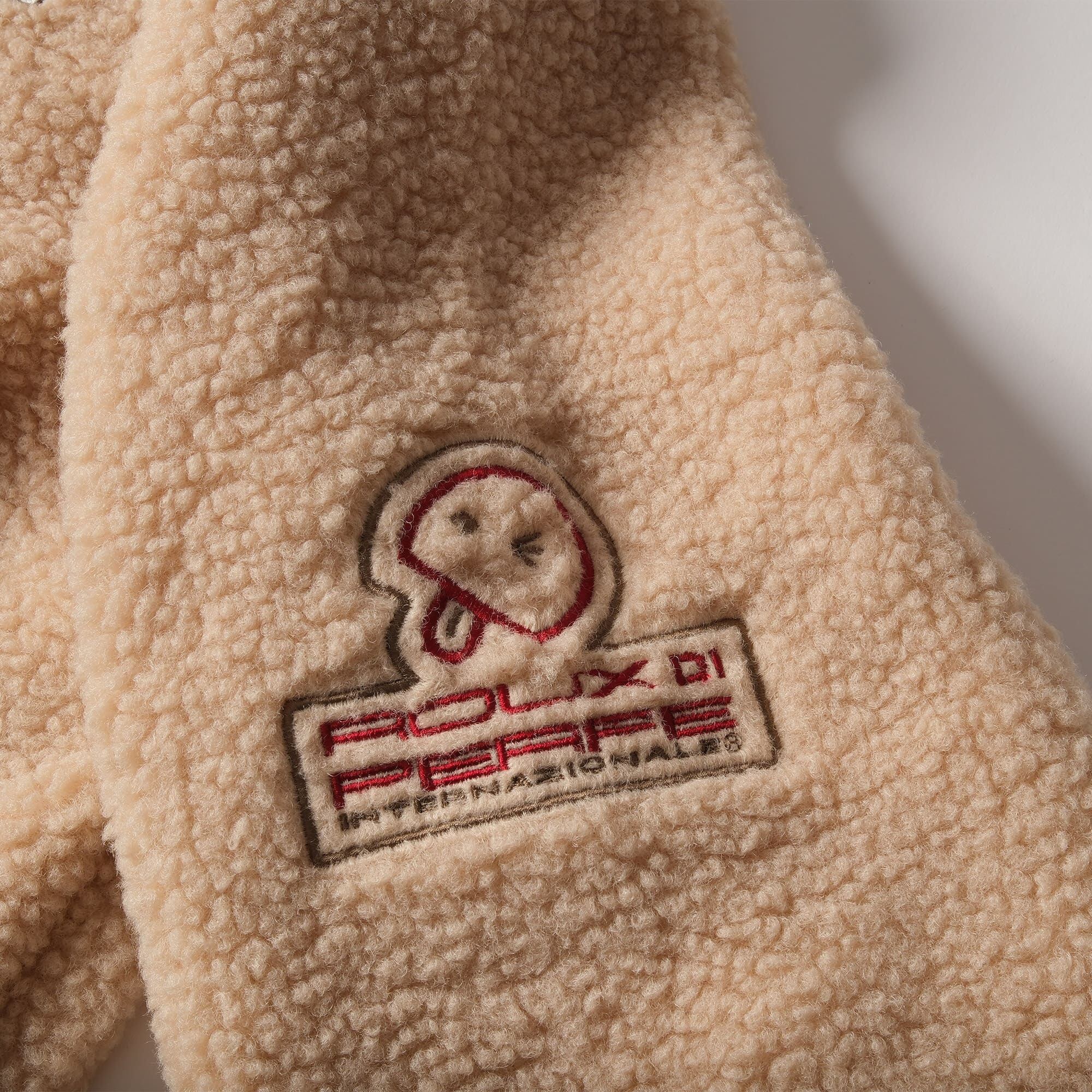 フロントの左胸にブランドロゴ・左袖にべーちゃんのワンポイント刺繍入り。